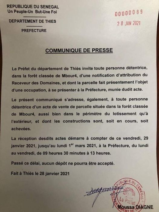 Le préfet Moussa Diagne, s’est fendu d’un communiqué, ce jeudi, pour inviter les personne détentrices, dans la forêt classée de Mbour 4, d’une notification d’attribution du Recevoir des Domaines, et dont la parcelle fait présentement l’objet d’une occupation, à se présenter à la préfecture munies dudit acte.