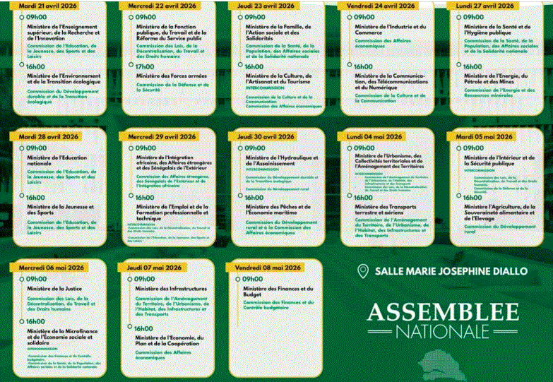 L’Assemblée nationale du Sénégal a rendu public, ce lundi, le calendrier de passage des ministres devant les commissions permanentes, dans le cadre du contrôle de l’action gouvernementale. Vingt-cinq (25) ministres sont concernés par cette série d’auditions, qui se déroulera du 21 avril au 8 mai 2026.