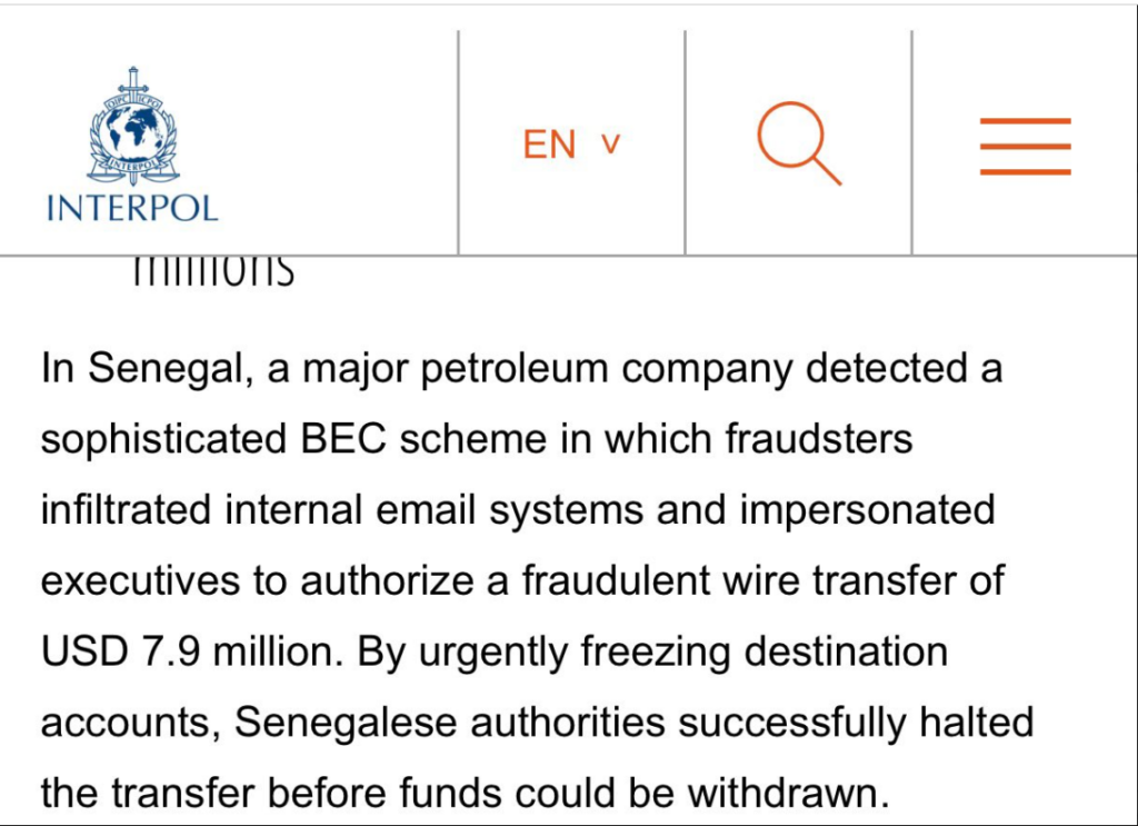 « Au Sénégal, une grande compagnie pétrolière a détecté un stratagème BEC sophistiqué dans lequel des fraudeurs ont infiltré les systèmes de messagerie interne et se sont fait passer pour des dirigeants afin d’autoriser un virement frauduleux de 7,9 millions de dollars américains », précise Interpol dans son communiqué.