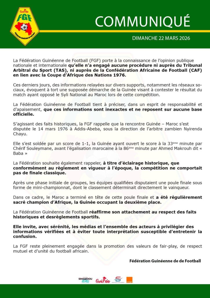 La Fédération Guinéenne de Football tient à démentir formellement ces rumeurs et précise que aucune procédure judiciaire n’a été engagée par la FGF ou toute autre instance guinéenne auprès du TAS concernant cette affaire.