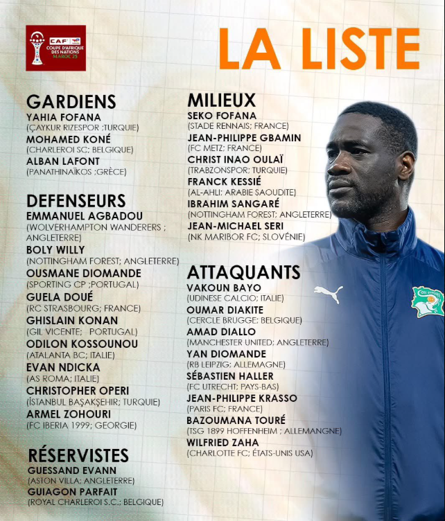 Le sélectionneur ivoirien Emerse Faé a rendu publique, le 9 décembre 2025, la liste définitive des 26 joueurs retenus pour la Coupe d’Afrique des Nations (CAN) qui se tiendra au Maroc du 21 décembre 2025 au 18 janvier 2026. Les Éléphants sont prêts pour un défi relevé au Maroc...