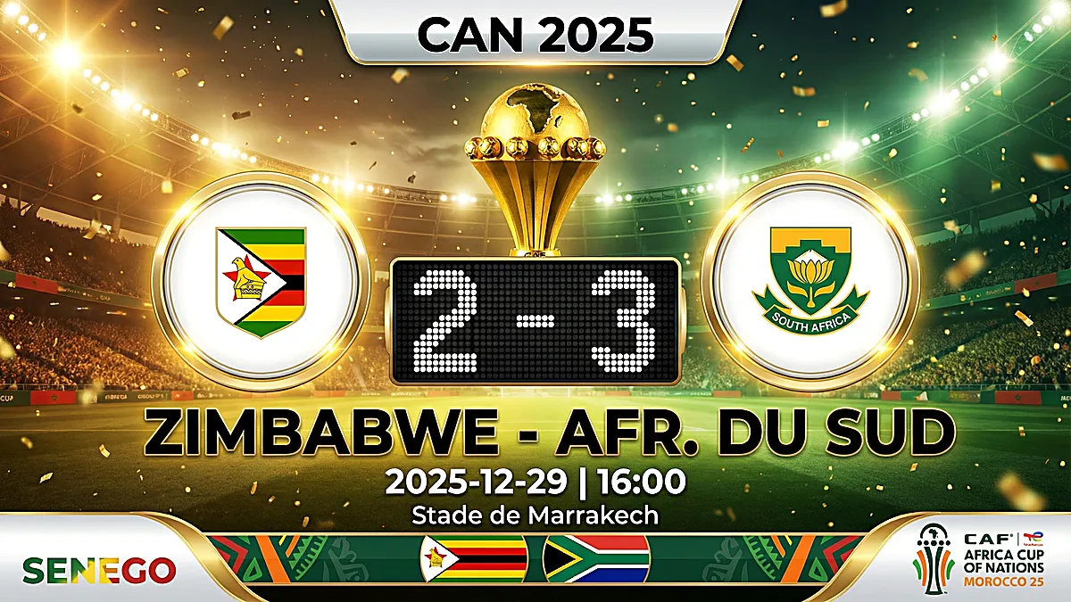 Au terme d’une rencontre riche en rebondissements au Stade de Marrakech, l’Afrique du Sud a arraché une victoire cruciale face au Zimbabwe (3-2) ce lundi 29 décembre, dans le cadre de la phase de groupes de la Coupe d’Afrique des Nations 2025. Ce duel du Groupe B a tenu toutes ses promesses, offrant un spectacle offensif et une fin de match dramatique qui permet aux Bafana Bafana de confirmer leur bon début de compétition.