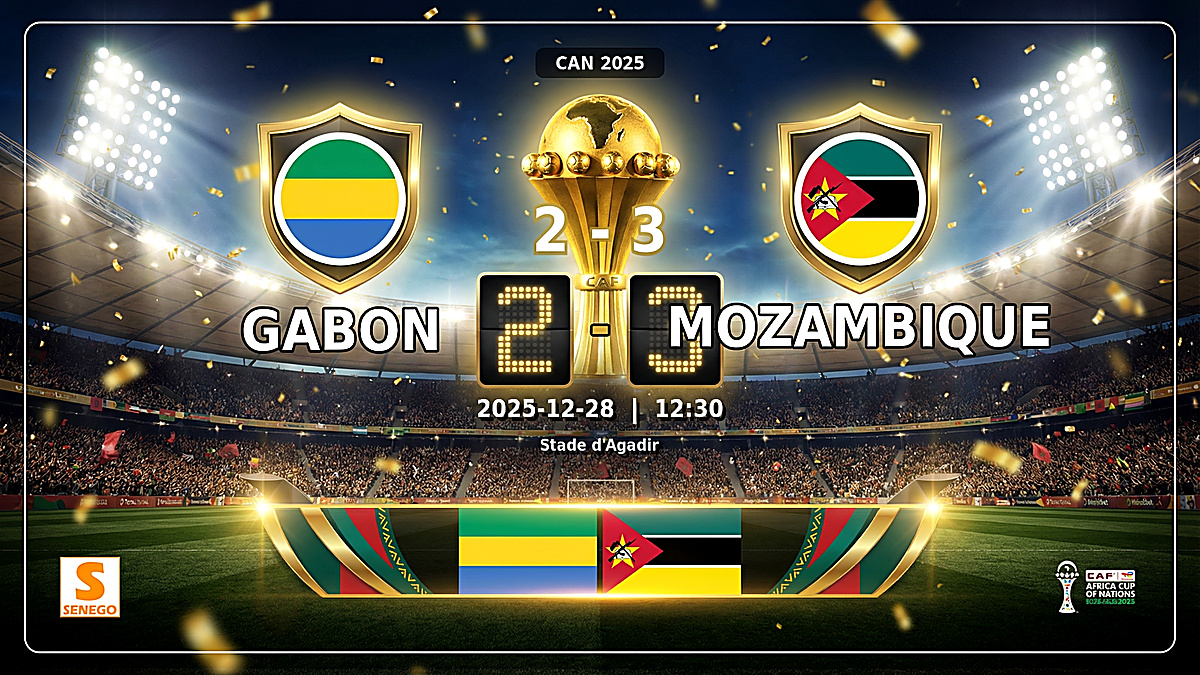 Dans le cadre de la phase de groupes de la Coupe d’Afrique des Nations 2025 au Maroc, le Stade d’Agadir a été le théâtre d’une rencontre palpitante ce dimanche 28 décembre. Les Panthères du Gabon affrontaient les Mambas du Mozambique pour le compte du Groupe F. Au terme d’un match riche en rebondissements et en intensité, c’est le Mozambique qui a réussi à tirer son épingle du jeu en s’imposant sur le score serré de 3 buts à 2.