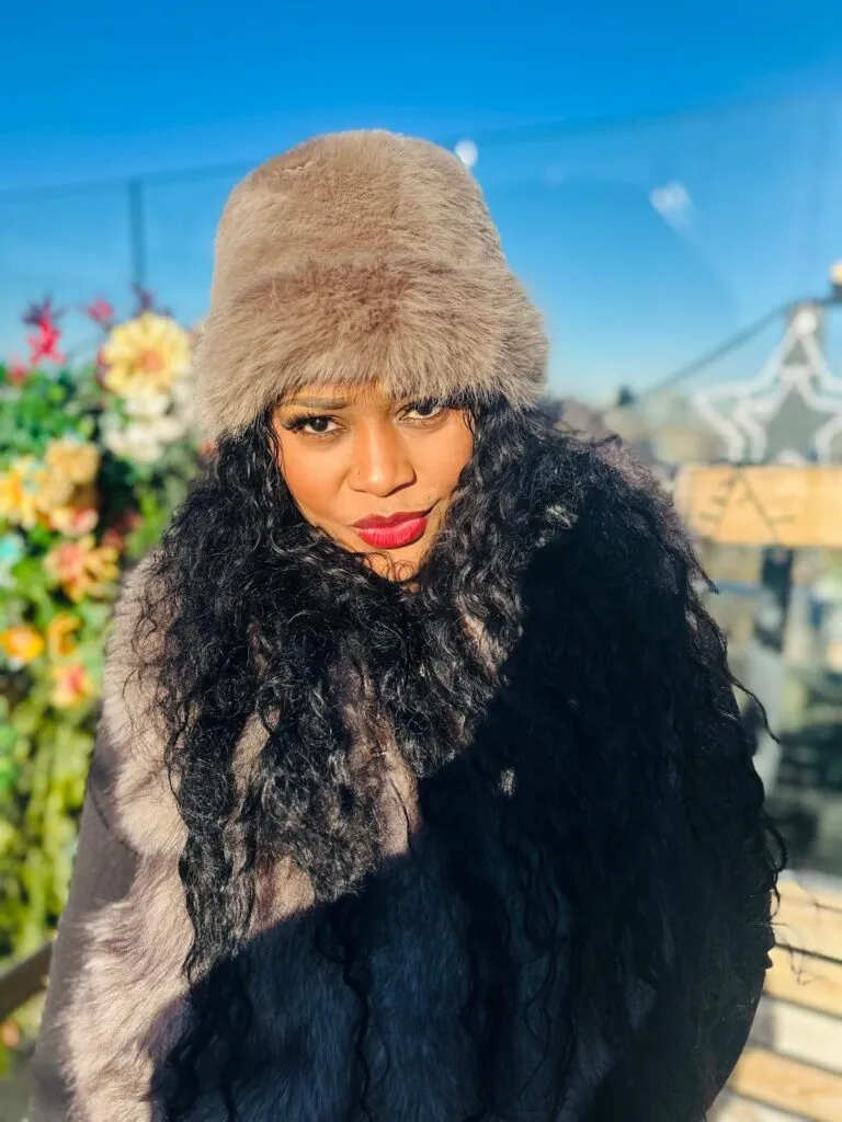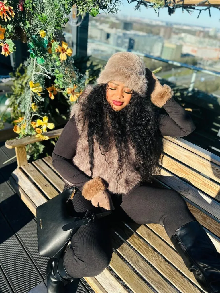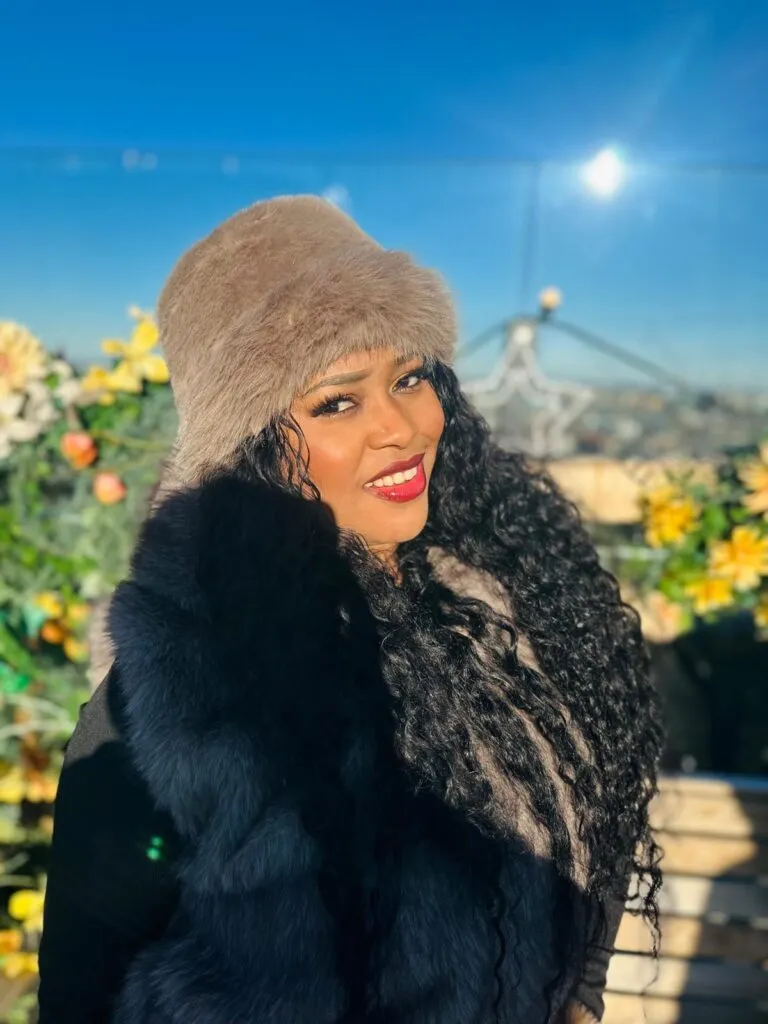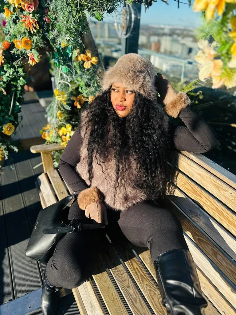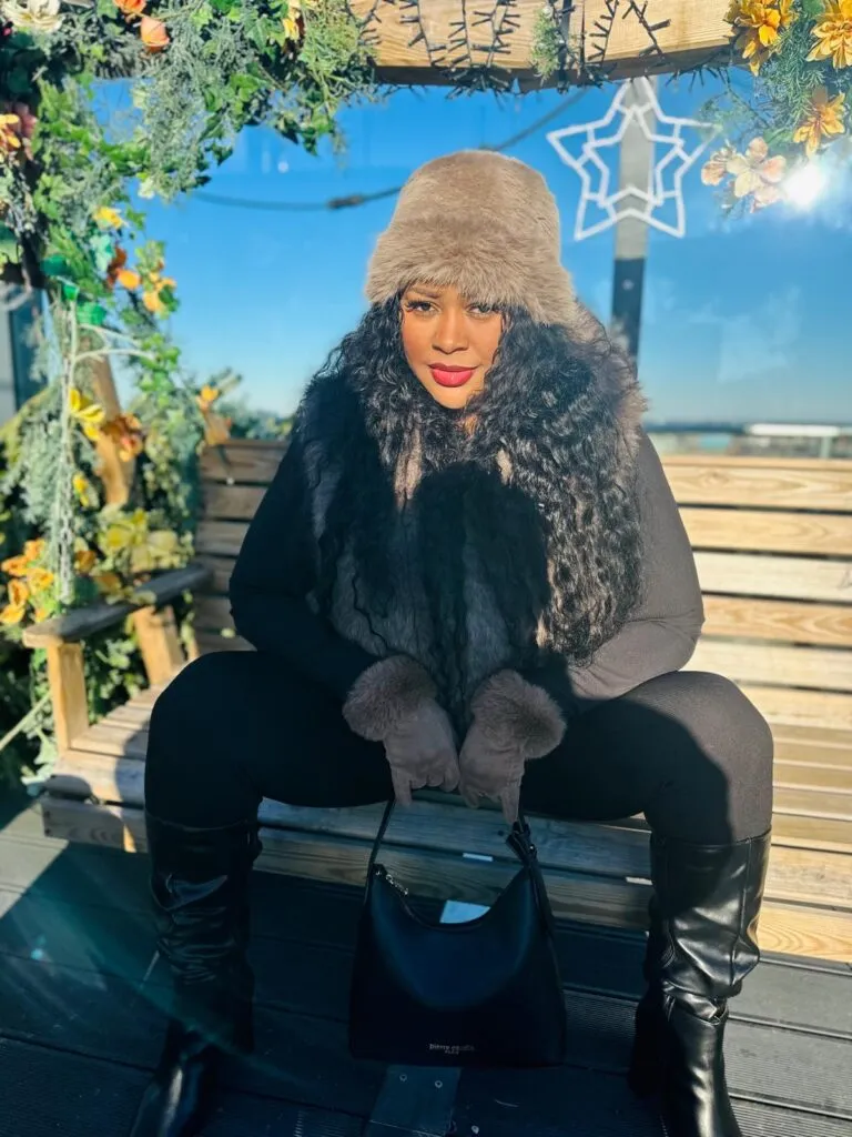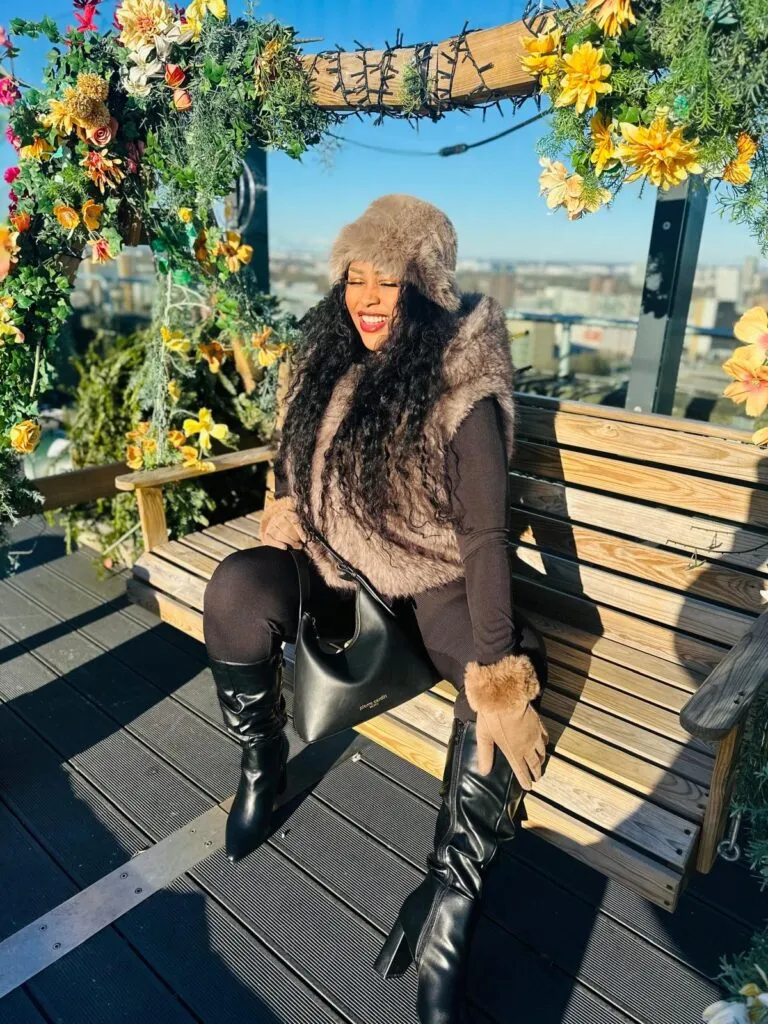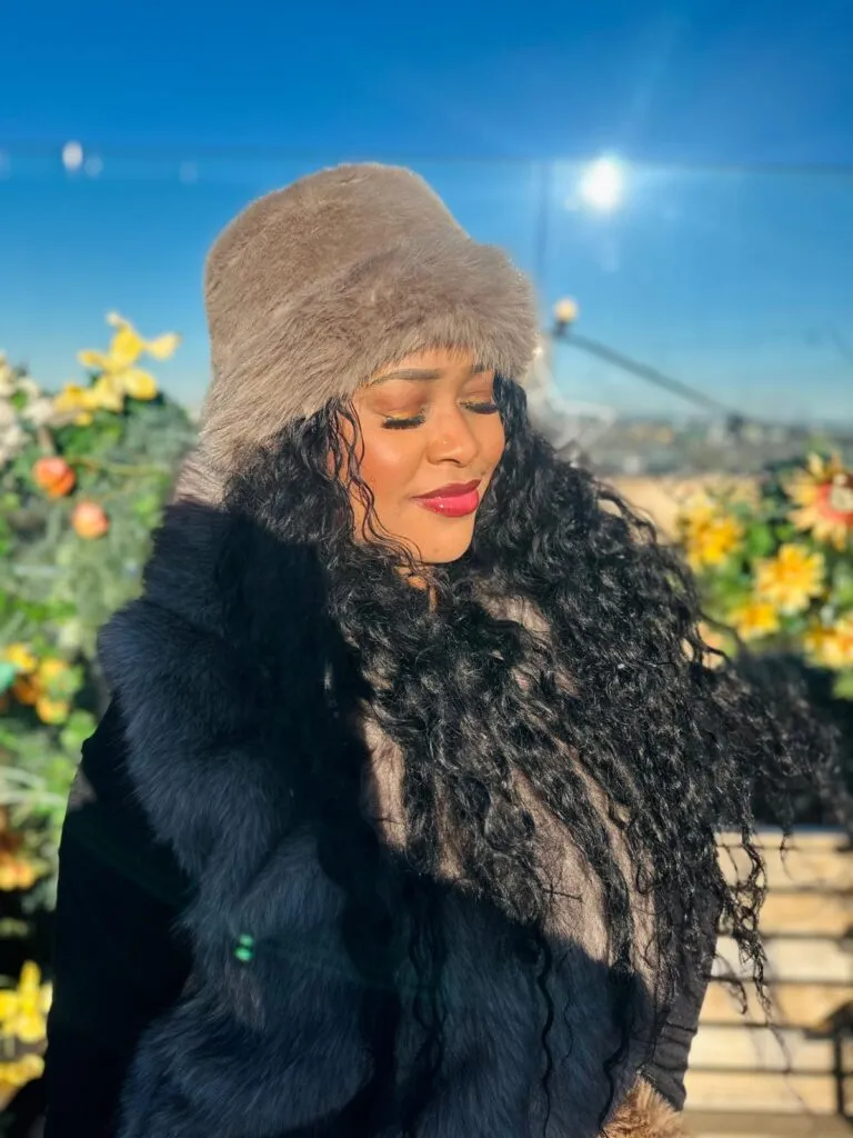 Sur les clichés diffusés et repris par nos confrères de « Kawtef », la chanteuse affiche un style hivernal soigné. Elle apparaît vêtue d’un gilet en fourrure beige, assorti à un chapeau et des gants de la même teinte. L’ensemble est complété par une tenue noire, incluant un legging et des bottes en cuir, ainsi qu’un sac de luxe. La mise en scène la montre posant sur un banc en bois, dans un décor ensoleillé agrémenté de fleurs.