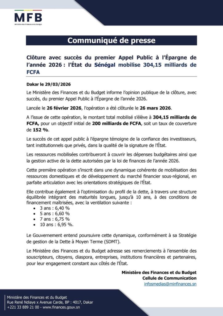 Le gouvernement sénégalais, à travers le Ministère des Finances et du Budget, a annoncé le succès du premier appel public à l’épargne de l’année 2026. Lancée le 26 février et clôturée le 26 mars, l’opération a permis de mobiliser un montant total de 304,15 milliards de FCFA, dépassant largement l’objectif initial fixé à 200 milliards de FCFA.