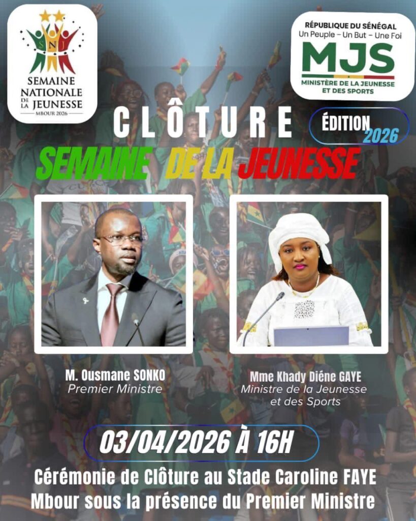 Le Premier Ministre Ousmane Sonko, accompagné de la Ministre Khady Diène Gaye, présidera la clôture de la Semaine Nationale de la Jeunesse 2026, prévue le vendredi 3 avril à 16h au Stade Caroline Faye de Mbour.