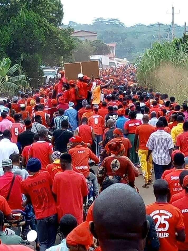 Les opposants à un éventuel 3ème mandat d’Alpha Condé, tous habillés en rouge, se sont donné rendez-vous au carrefour Komou situé à l’entrée de la ville de Nzérékoré. C’est de là que la marche a commencé avant que les manifestants n’arrivent sur le terrain rouge situé à la scierie où leur meeting a eu lieu.