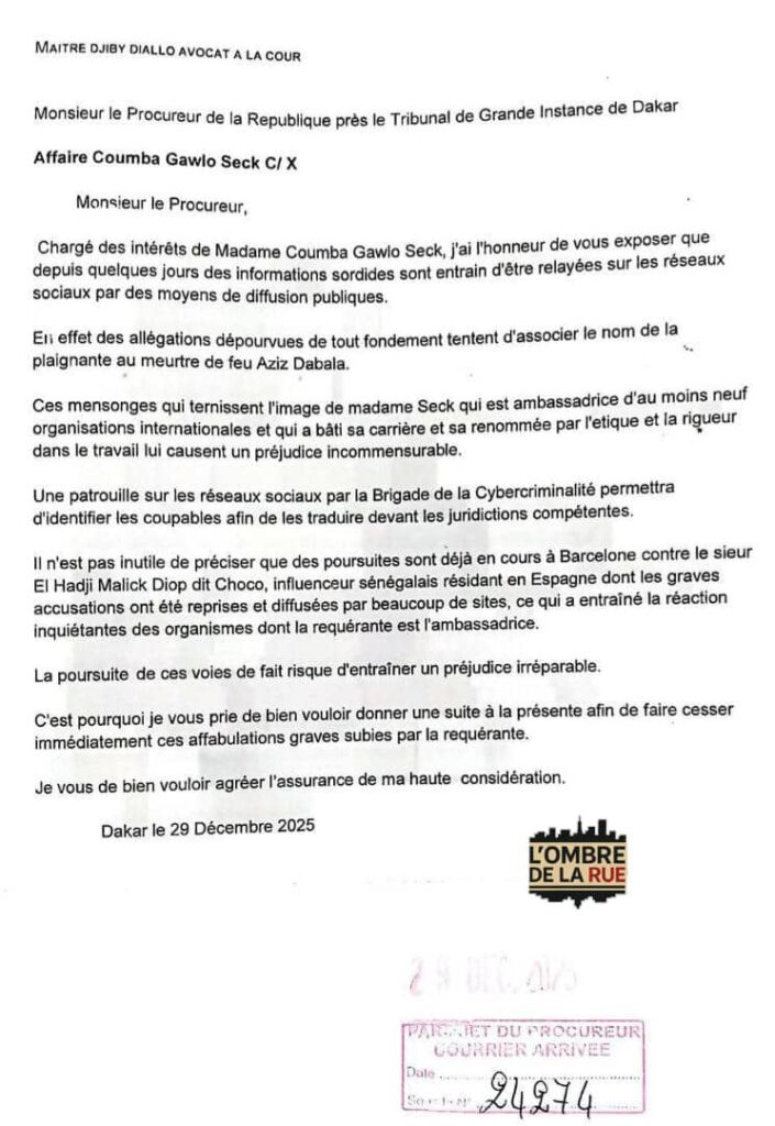 Agissant au nom de Madame Coumba Gawlo Seck, l’avocat Maître Djiby Diallo, avocat à la Cour, a déposé une plainte contre El Hadji Malick Diop dit Choco, influenceur sénégalais résidant en Espagne. Selon l’avocat des allégations, totalement dépourvues de fondement, tentent d’associer le nom de sa cliente, Coumba Gawlo au meurtre de feu Aziz Dabala.