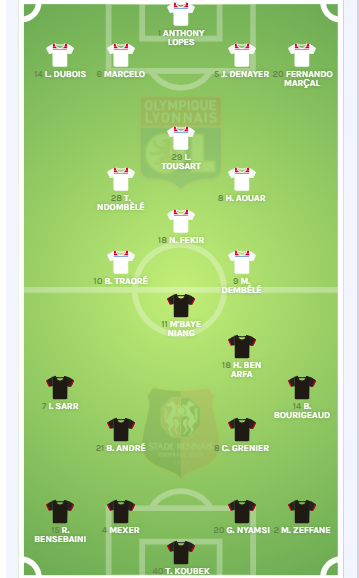 Le jeu du Stade Rennais s’articule un 4-2-3-1 classique avec Thomas Koubek dans les buts. Le Tchèque peut compter sur Mehdi Zeffane, Gerzino Nyamsi, Mexer et Ramy Bensebaini en défense. Clément Grenier et Benjamin André forment le double pivot tandis que Benjamin Bourigeaud et Ismaïla Sarr prennent les ailes. Hatem Ben Arfa évolue en soutien de M’Baye Niang.