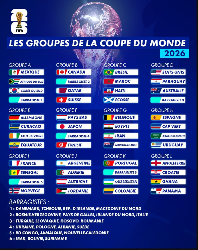 Six barrages compléteront le tableau final, avec des nations comme le Danemark, la Pologne, le Pays de Galles, l’Irlande du Nord, le Kosovo, la Jamaïque ou encore l’Irak. Des équipes habituées des grandes compétitions et qui pourraient rebattre les cartes dans plusieurs groupes.