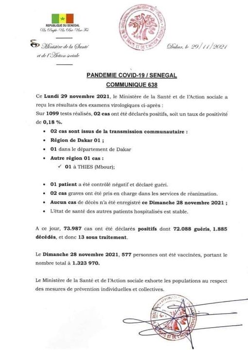 Le Sénégal a enregistré deux nouvelles infections liés à la pandémie du coronavirus (Covid-19), a annoncé ce lundi 29 novembre, le ministère de la Santé et de l’action sociale dans son bilan quotidien.