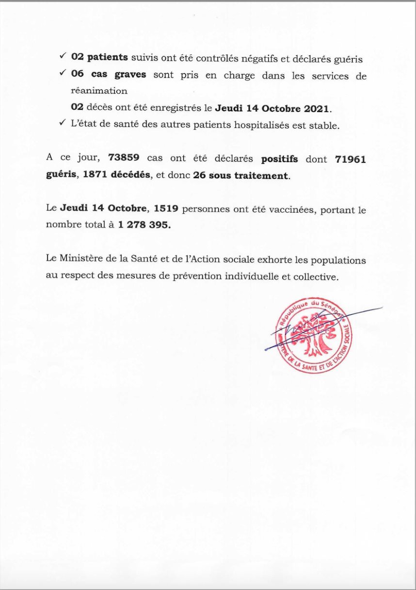 Le ministère de la Santé et de l’action sociale a fait le point sur la situation journalière de l’évolution de la Covid-19 au Sénégal, ce vendredi 15 octobre 2021.