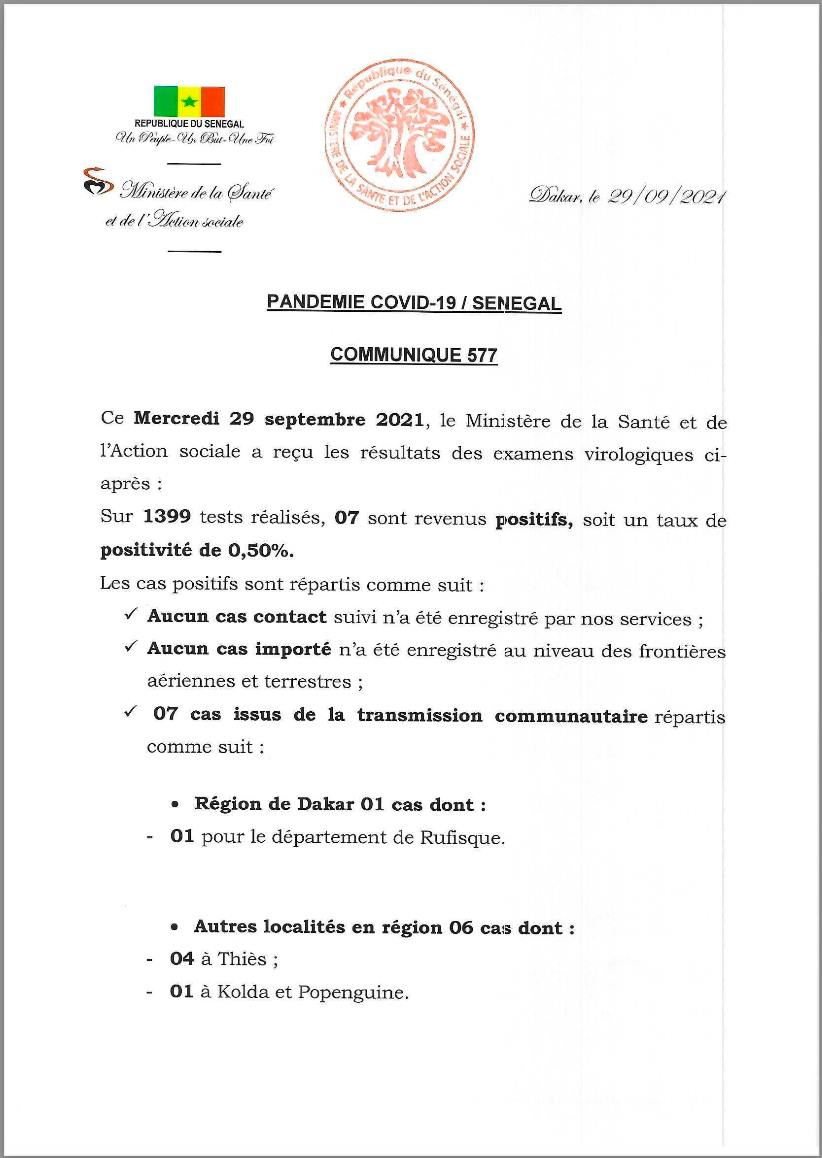 Le ministère de la Santé et de l’action sociale a fait le point sur la situation journalière de l’évolution de la Covid-19 au Sénégal, ce mercredi 29 septembre 2021.