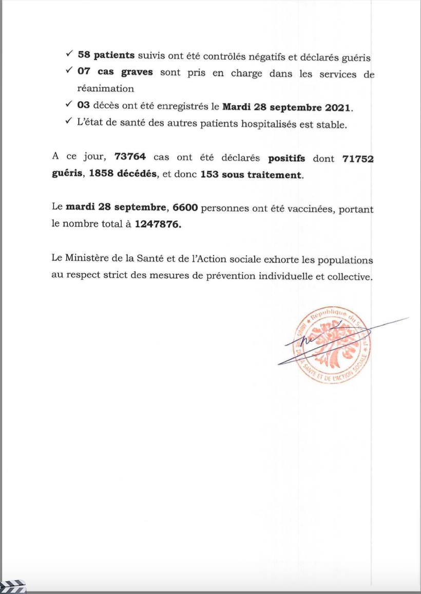 03 décès ont été enregistrés le mardi 28 septembre 2021. L’état de santé des autres patients reste stable.