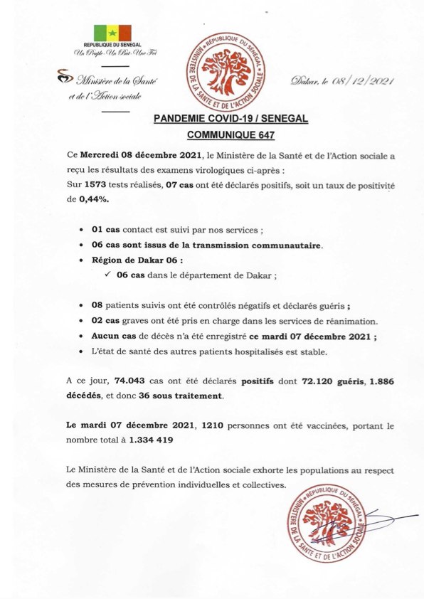 Le ministère de la Santé et de l’action sociale a fait le point sur la situation journalière de l’évolution de la Covid-19 au Sénégal, ce mercredi 08 décembre 2021.