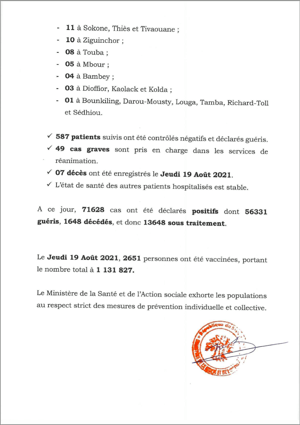 07 décès ont été enregistrés ce jeudi 19 août. L’état de santé des autres patients hospitalisés est stable.