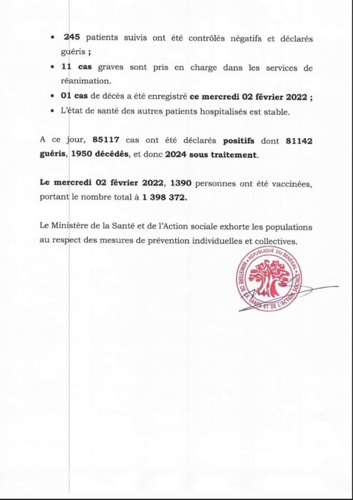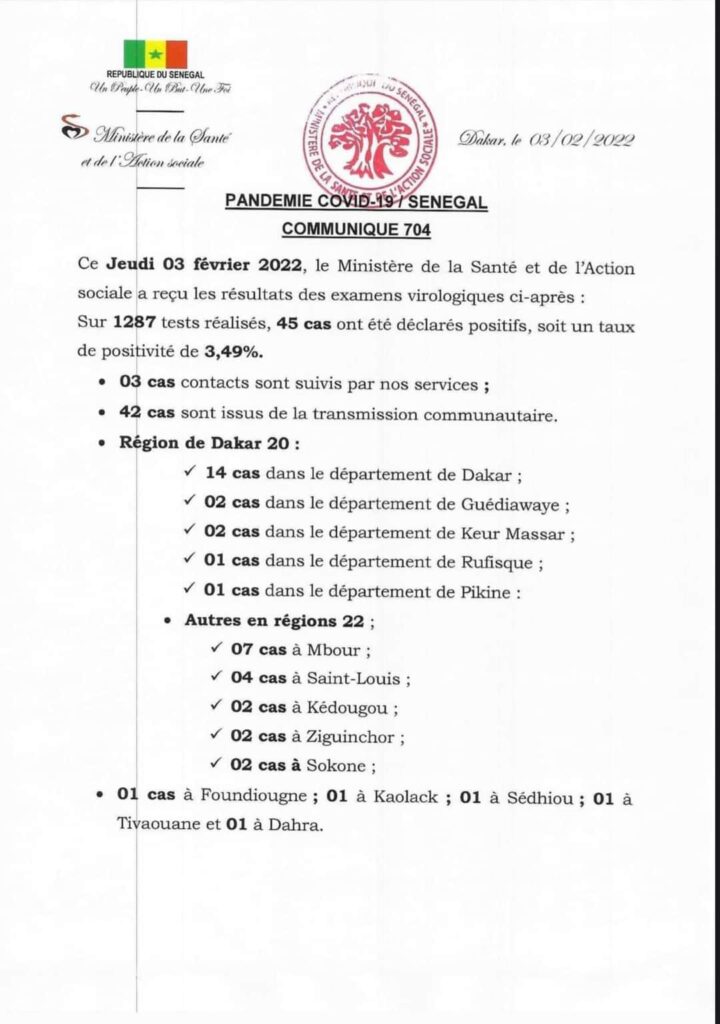 Le Sénégal a déploré et nouvelles infections liés à la pandémie du coronavirus (Covid-19), a annoncé ce jeudi 3 février, le ministère de la Santé et de l’action sociale dans son bilan quotidien.