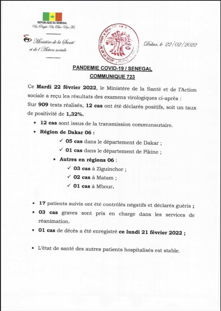 Le ministère de la Santé et de l’action sociale a fait le point sur la situation journalière de l’évolution de la Covid-19 au Sénégal, ce mardi 22 février 2022.