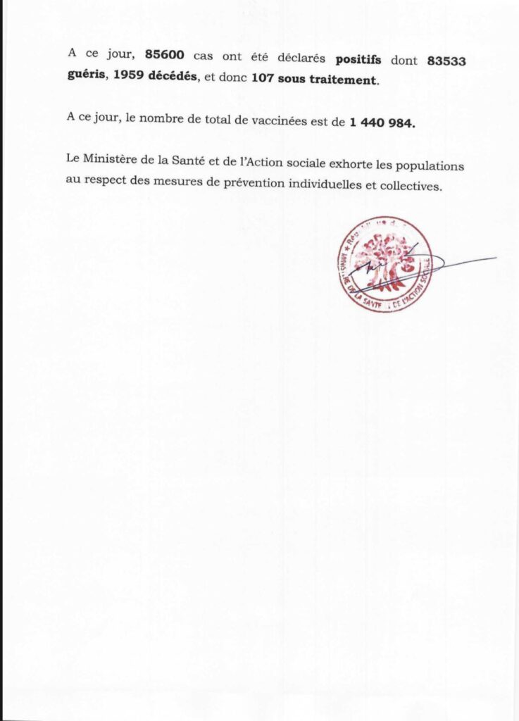 A ce jour 85 600 cas ont été déclarés positifs dont 83 533 guéris, 1959 décès et 107 sous traitement.
