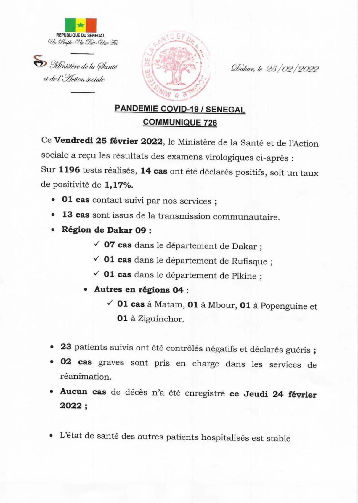 Le ministère de la Santé et de l’action sociale a fait le point sur la situation journalière de l’évolution de la Covid-19 au Sénégal, ce vendredi 25 février 2022.