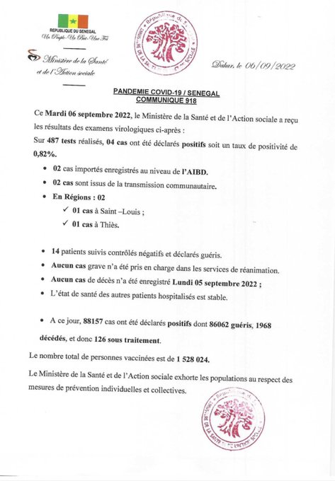 Le ministère de la Santé et de l’action sociale a fait le point sur la situation journalière de l’évolution de la Covid-19 au Sénégal, ce mardi 06 septembre 2022.