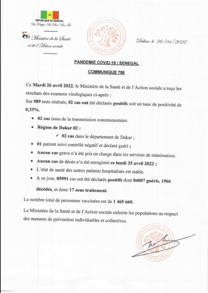 Le ministère de la Santé et de l’action sociale a fait le point sur la situation journalière de l’évolution de la Covid-19 au Sénégal, ce mardi 26 avril 2022.