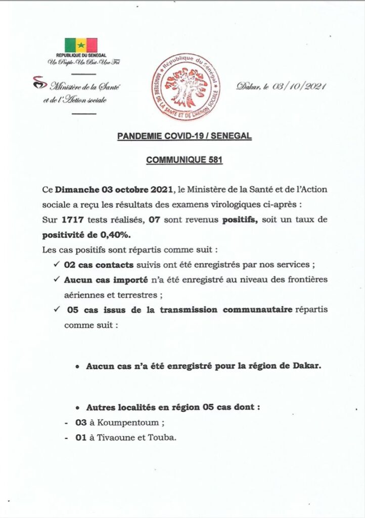 Le ministère de la Santé et de l’action sociale a fait le point sur la situation journalière de l’évolution de la Covid-19 au Sénégal, ce dimanche 03 octobre 2021.