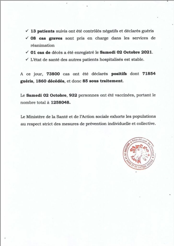 01 décès a été enregistré le samedi 02 octobre 2021. L’état de santé des autres patients reste stable.