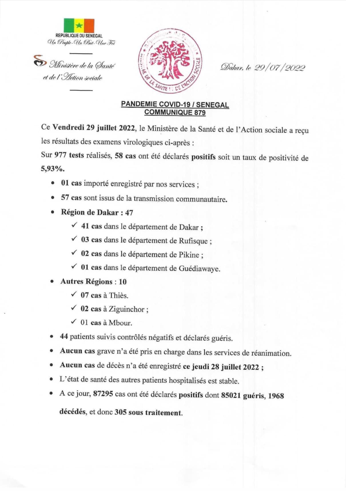 Le ministère de la Santé et de l’Action sociale a fait le point sur la situation journalière de l’évolution de la Covid-19 au Sénégal, ce vendredi 29 juillet 2022.