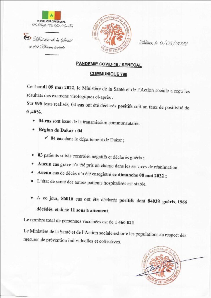 Le ministère de la Santé et de l’action sociale a fait le point sur la situation journalière de l’évolution de la Covid-19 au Sénégal, ce lundi 09 mai 2022.