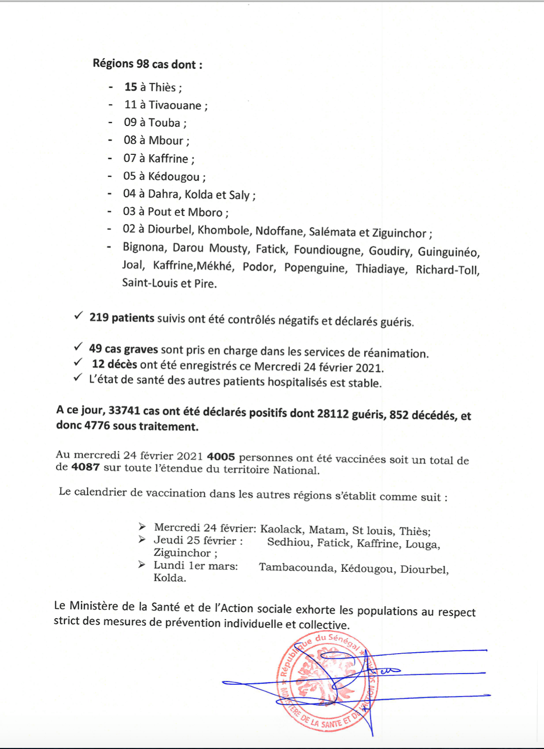 Le Sénégal a déploré 12 décès et 288 nouvelles infections liées à la pandémie du coronavirus, a annoncé ce jeudi 25 février, le ministère de la Santé et de l’action sociale dans son bilan quotidien. 189 cas sont issus de la transmission communautaire.