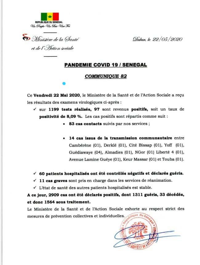 Quatorze (14) cas issus de la transmission communautaire ont été décelés ce vendredi 22 Mai, au Sénégal. Selon le Directeur de cabinet du ministre de la Santé, Aloyse Waly Diouf qui a fait le point de la situation, ils proviennent de Cambérène (1), Derklé (1), Cité Bissap (1), Yoff (1), Guédiawaye (4), Almadies (1), Ngor (1), Liberté 4 (1), Avenue Lamine Guèye (1) Keur Massar (1) et Touba (1).