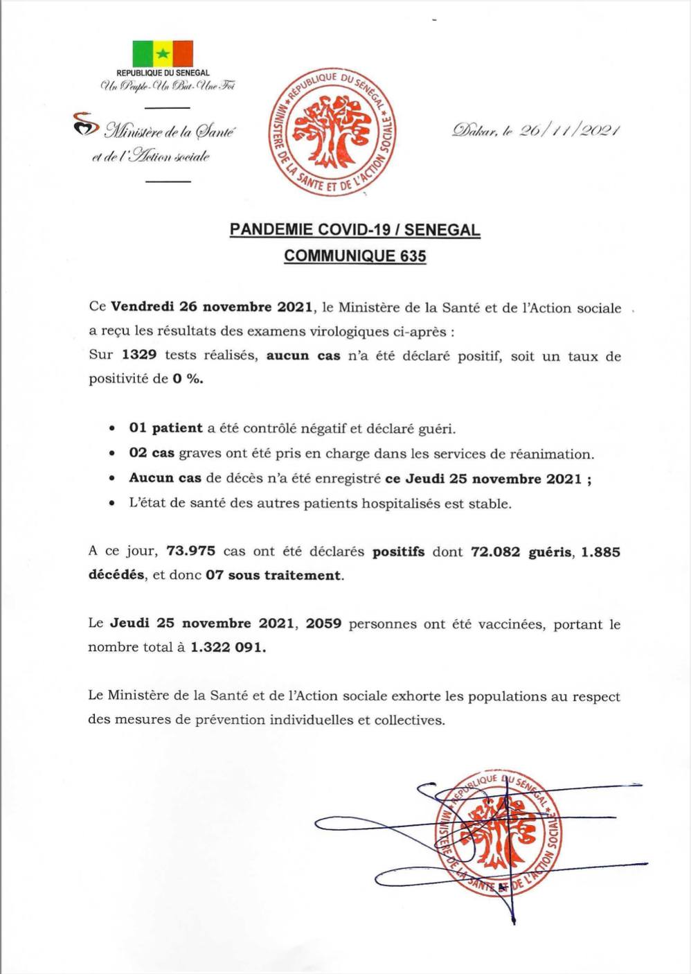 A ce jour 73975 cas ont été déclarés positifs dont 72082 guéris, 1885 décès et 07 sous traitement. 1.322.091 personnes ont été vaccinées au Sénégal.