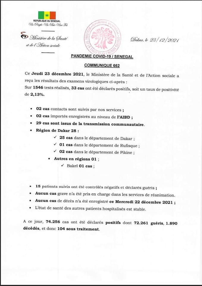 Le Sénégal a enregistré 2 nouvelles infections liés à la pandémie du coronavirus (Covid-19), a annoncé ce jeudi 23 décembre, le ministère de la Santé et de l’action sociale dans son bilan quotidien.