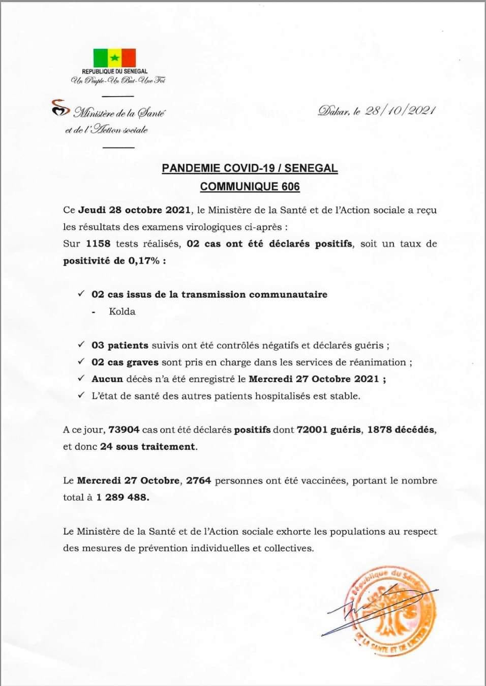 Le Sénégal a enregistré 2 nouvelles infections liés à la pandémie du coronavirus (Covid-19), a annoncé ce jeudi 28 octobre, le ministère de la Santé et de l’action sociale dans son bilan quotidien.
