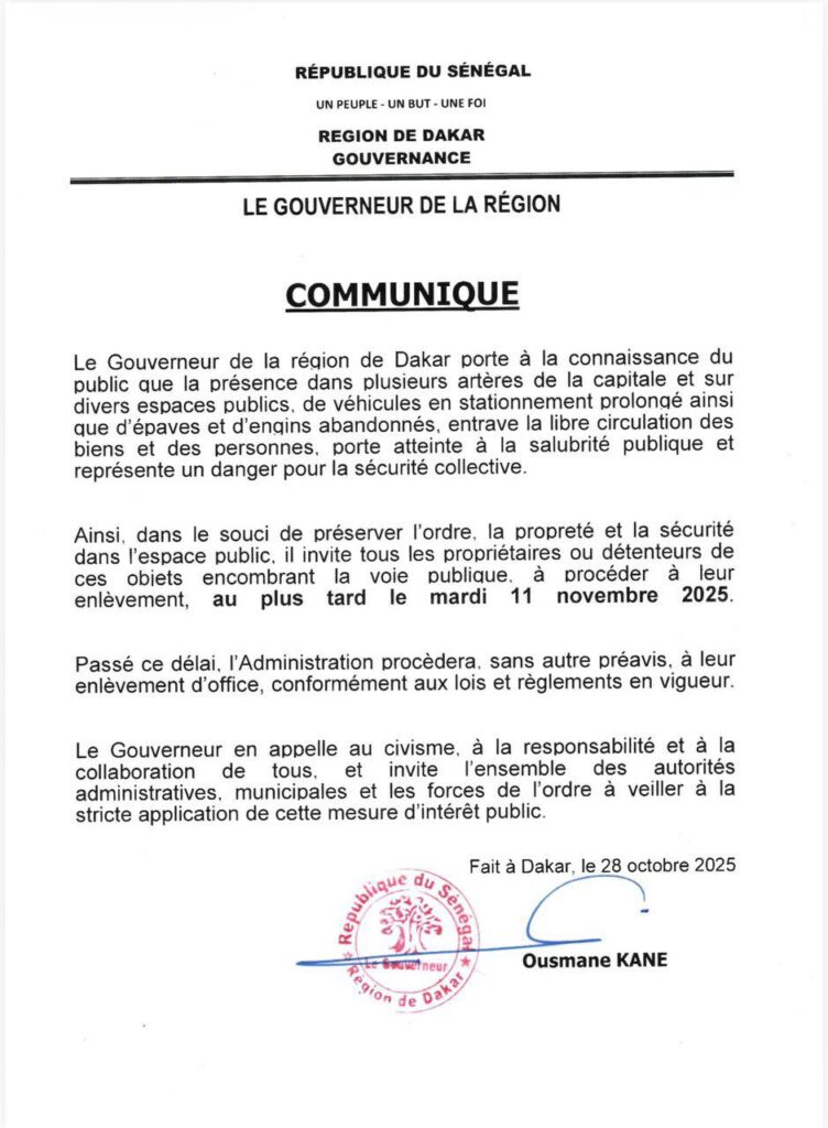 Le Gouverneur de la région de Dakar, Ousmane Kane, a publié un communiqué ce mardi 28 octobre 2025, appelant les propriétaires de véhicules en stationnement prolongé, d’épaves et d’engins abandonnés à les retirer des voies publiques et espaces communs.