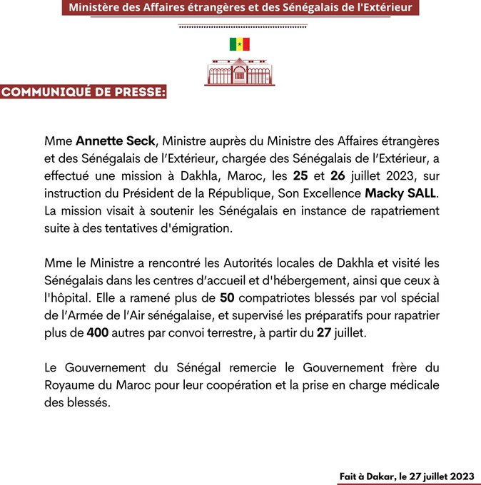 D’après le ministère des Affaires Étrangères et des Sénégalais de L’Extérieur, la mission visait à soutenir les Sénégalais en instance de rapatriement suite à des tentatives d’émigration.