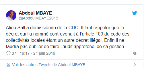 L’ancien premier ministre Abdoul Mbaye a aussitôt réagi suite à l’annonce, par Aliou Sall, de sa démission de la direction générale de la Caisse des dépôts et consignations. Le leader de l’Alliance pour la citoyenneté et le travail (ACT) exige un audit approfondi de sa gestion.