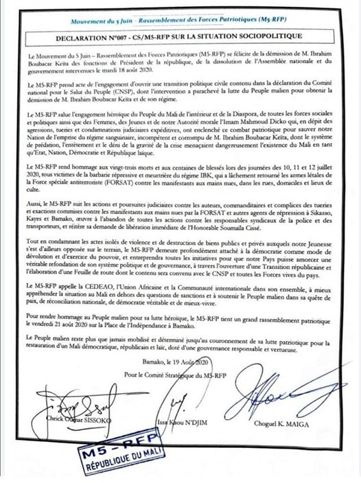 Première déclaration du mouvement du 5 juin-rassemblement des forces patriotiques (M5-RFP) dirigé par l’imam Mahmoud Dicko, suite au coup d’Etat contre le président Malien Ibrahim Boubacar Keïta.