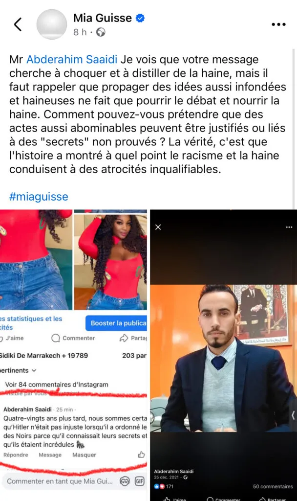 Selon les éléments rapportés par nos confrères de Kawtef, l’incident est survenu suite au message posté par l’artiste pour saluer la performance de l’équipe nationale. Si la majorité des interactions sont restées courtoises, un commentaire signé par un internaute identifié comme Abderahim Saaidi a tranché par sa violence. L’auteur a proféré des insultes à caractère raciste, allant jusqu’à évoquer la figure d’Adolf Hitler pour appuyer des propos haineux visant la communauté noire.