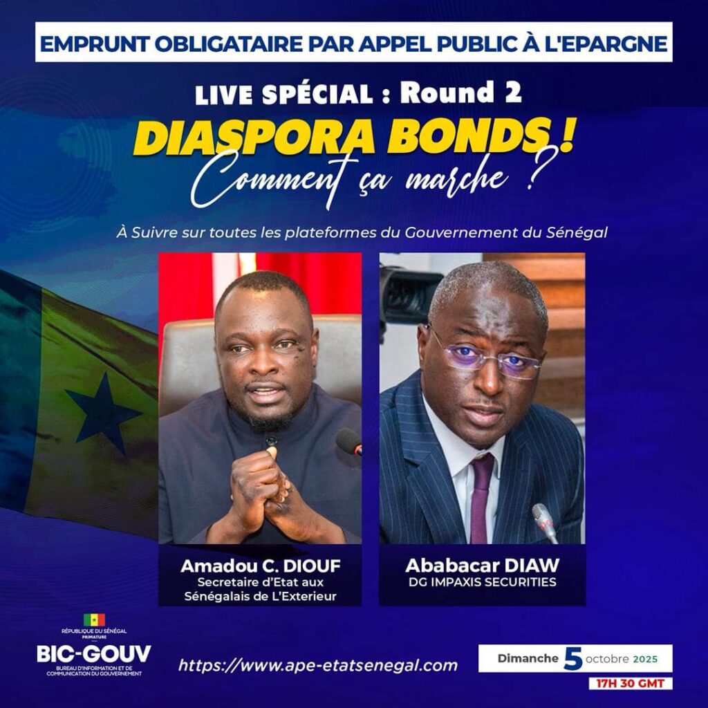 Étant donné que la période de souscription aux Diaspora Bonds s’étend du 22 septembre au 10 octobre 2025, ce live arrive à un moment clé pour la diaspora. Le direct spécial Round 2 sur les Diaspora Bonds du Sénégal est l’occasion parfaite pour obtenir des informations détaillées directement du gouvernement et des experts financiers. Le live est prévu ce dimanche 5 octobre à 17h30, est spécifiquement dédié aux questions sur la souscription et la procédure.