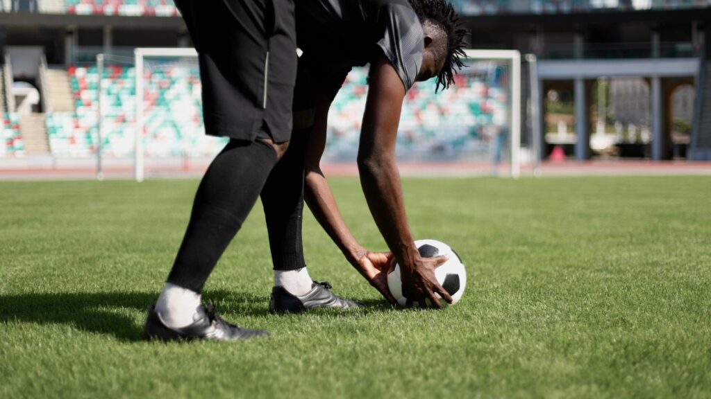 Alt text: Joueur place ballon sur la pelouse