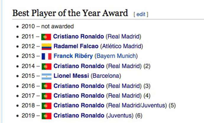 Ronaldo a remporté ce prix quatre années de suite. En fait, le joueur de 34 ans l’a remporté six ans sur neuf.