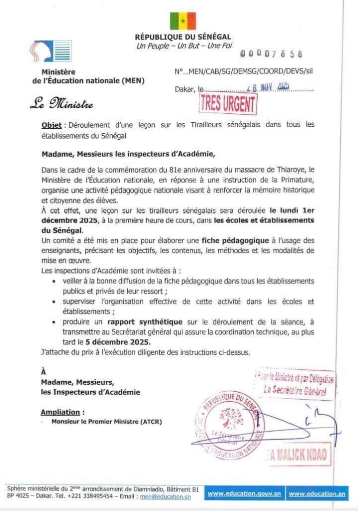 Ce lundi 1er décembre 2025, l’ensemble des écoles et établissements du Sénégal consacreront la première heure de cours à une leçon dédiée aux tirailleurs sénégalais. Cette initiative du ministère de l’Éducation nationale s’inscrit dans le cadre de la commémoration du 81ᵉ anniversaire du massacre de Thiaroye, un événement tragique de l’histoire du pays.