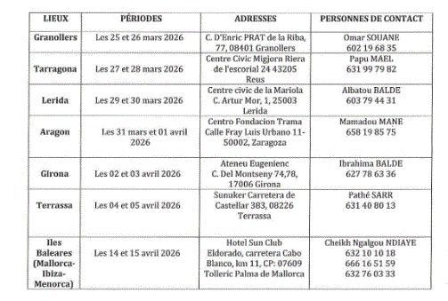 La mission débutera à Granollers les 25 et 26 mars, avant de se poursuivre à Tarragona (27-28 mars), Lerida (29-30 mars) puis en Aragon (31 mars et 1er avril). Elle fera ensuite escale à Girona les 2 et 3 avril, puis à Terrassa les 4 et 5 avril. La dernière étape est prévue dans les Îles Baléares (Mallorca, Ibiza, Menorca) les 14 et 15 avril, marquant la fin de cette opération destinée à rapprocher les services consulaires des Sénégalais établis en Espagne.