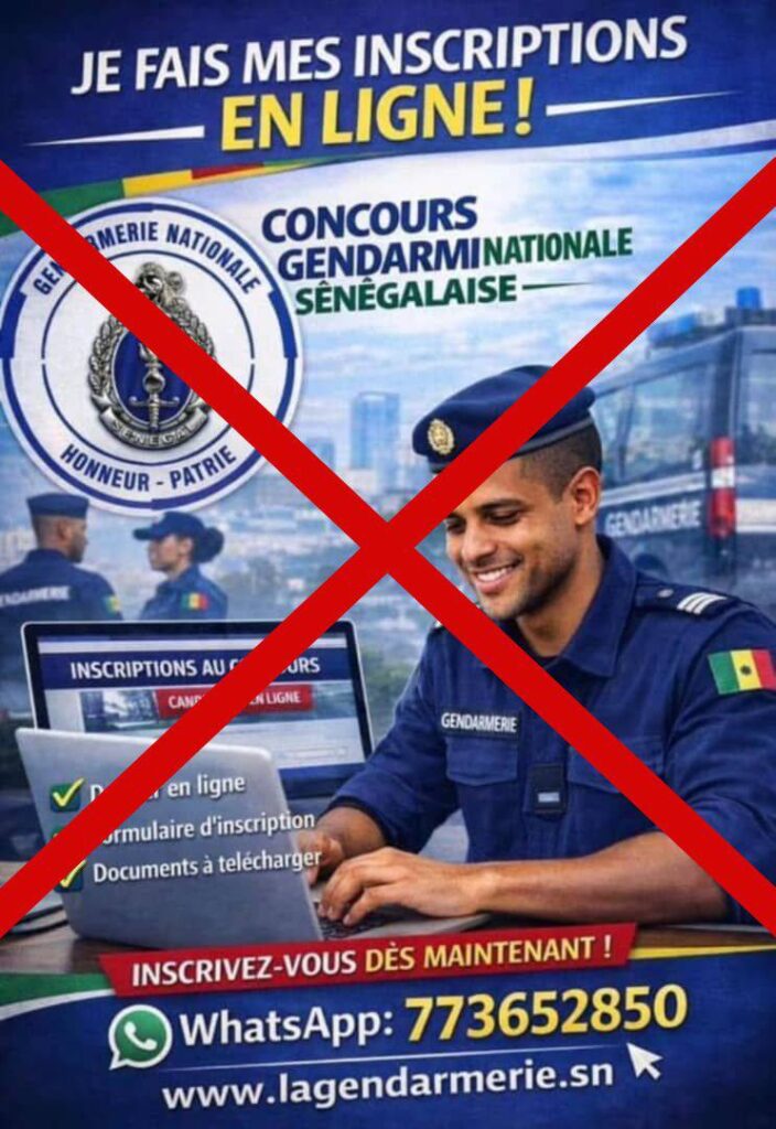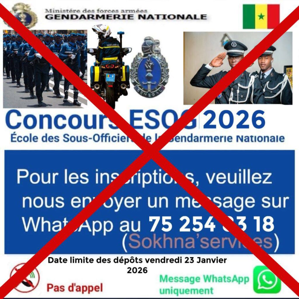 « Ne cliquez pas sur ces liens et ne payez rien. Seuls les canaux officiels sont fiables », avertit l’institution. Pour toute information fiable concernant les concours, la Gendarmerie recommande de consulter ses plateformes officielles : Site officiel : gendarmerie.sn ; Facebook : facebook.com/gendarmerienationale221 ; TikTok : tiktok.com/@gendarmerienationale221