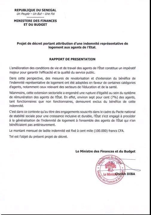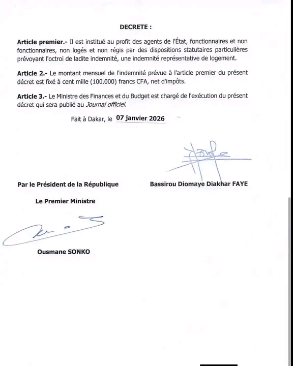 Le président de la République, Bassirou Diomaye Faye, a signé ce mercredi le décret n°2026-06 instituant une indemnité représentative de logement au profit de l’ensemble des agents de l’État qui n’en bénéficiaient pas jusque-là.