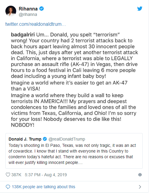 La chanteuse Rihanna tient pour principal responsable le Président américain Donald Trump. Cela fait suite aux deux fusillades notées aux Etats-Unis en moins de 24 heures et ayant fait 29 morts.