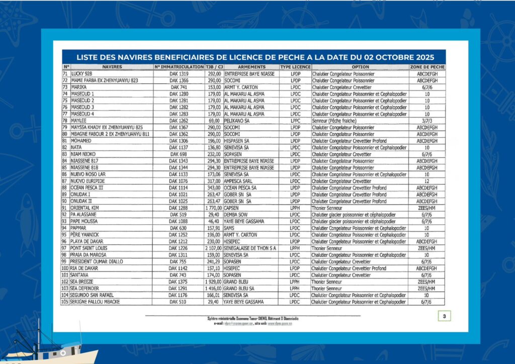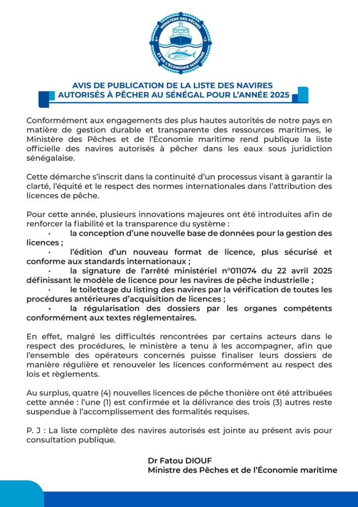 « Le ministère, dans un souci de transparence et d’éthique, dévoile la liste officielle des navires autorisés à pêcher pour l’année 2025, avec l’intégration de nouvelles innovations dans la procédure pour plus de transparence et de fiabilité », a indiqué la ministre sur son compte X visité par Senego.