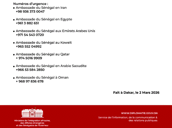 Face à la montée des tensions au Moyen-Orient, le Ministère de l’Intégration africaine, des Affaires étrangères et des Sénégalais de l’Extérieur a lancé un appel à vigilance pour les ressortissants sénégalais présents dans la région.